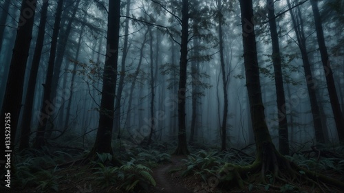 © Agry, Obraz premium A Foggy, Ancient Forest with Twisted Roots