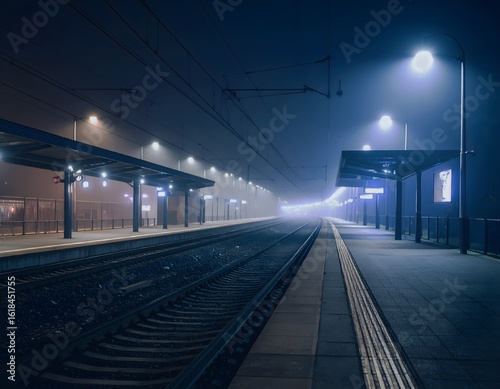 © Recon, Naklejka premium A foggy and lonely railway platform at night.