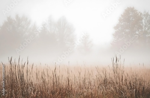 Obraz premium A foggy autumn meadow, with tall grasses and trees