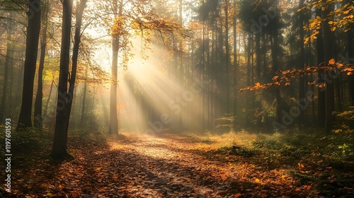 © Fidan, Obraz premium A foggy autumn morning in the forest with sunlight