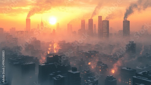 Fototapeta premium A foggy cityscape at sunrise, with smokestacks emitting pollution into the...