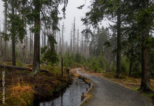 Naklejka premium A foggy day and a dirt road among big pine trees