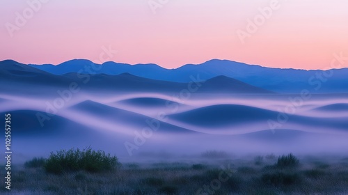 Fototapeta premium A foggy desert scene at dusk, with the last light of the day casting a soft glow over the mist-covered dunes