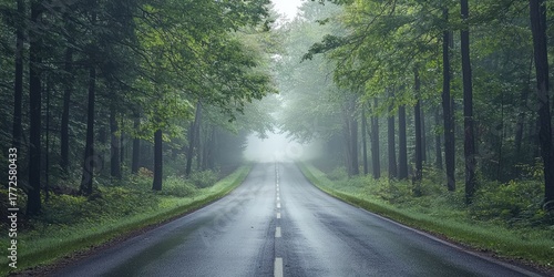 © Chanrothana Pech, Obraz premium A foggy, empty road with trees on both sides, leading into the distance.
