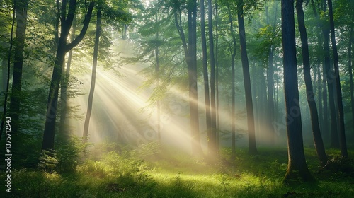© Suresh Thangavel, Obraz premium A foggy enchanted forest with streaks of sunlight piercing through
