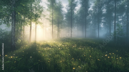 Fototapeta premium A foggy forest at dawn, with gentle rays of sunlight breaking through the mist