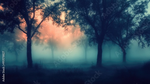 Obraz premium A foggy forest at dawn, with trees emerging from the mist, offering a...