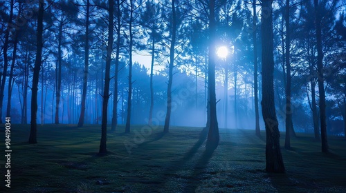 © Chandara, Obraz premium A foggy forest at night with a full moon casting shadows on the ground.