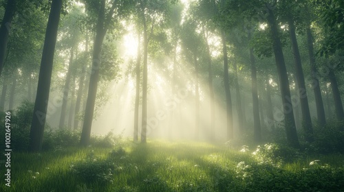 © S, Obraz premium A foggy forest clearing at daybreak, with light filtering through the mist