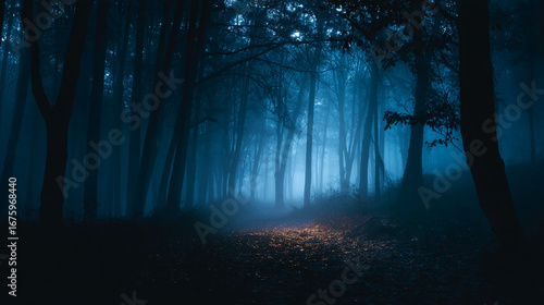 © Jhati, Naklejka premium A foggy forest landscape with tall trees and a mysterious light on the ground in the distance ahead view