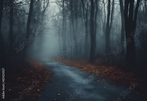 Fototapeta premium A foggy forest path with bare trees and fallen leaves on the ground. The atmosphere is eerie and mysterious.