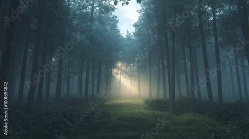 Fototapeta premium A foggy forest scene at sunrise, with faint rays of sunlight barely filtering...