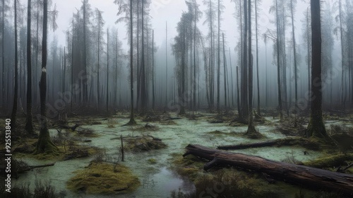 Obraz premium A foggy forest swamp with tall trees, fallen logs, and mossy terrain.
