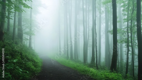 © ZeeZaa, Naklejka premium A foggy forest with a path through it