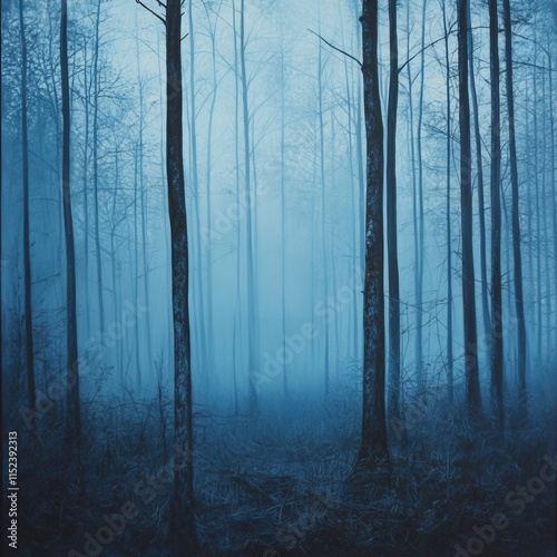 © Ishika, Fototapeta premium A foggy forest with tall, bare trees