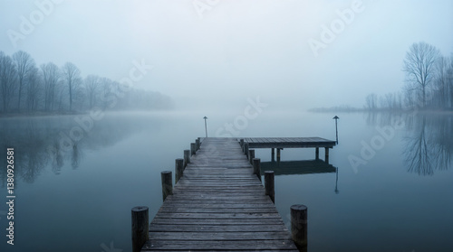 © Aida, Fototapeta premium A foggy lake with a wooden pier and a dock