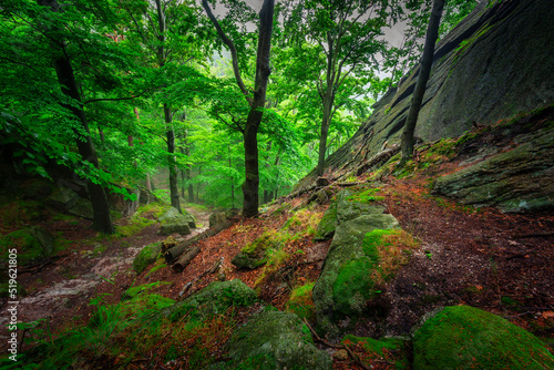 Naklejka premium A foggy landscape of stairs from hellish Valley to Chojnik Castle in the Karkonosze Mountains. Poland