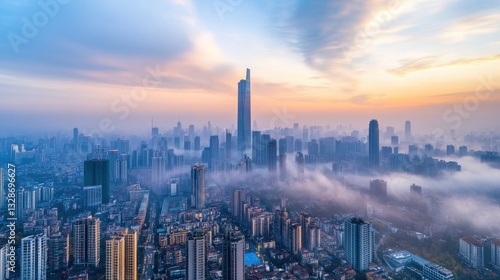 © Sawat, Fototapeta premium A foggy morning in a dense metropolis, with skyscrapers emerging through the mist
