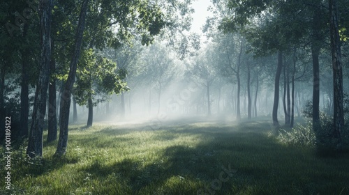 Obraz premium A foggy morning in a tranquil forest, with light softly filtering through the...