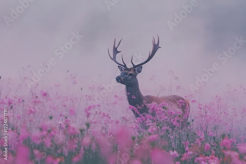 © Attasit, Fototapeta premium A foggy morning scene in a cosmos meadow, with a deer emerging from the mist in the distance.