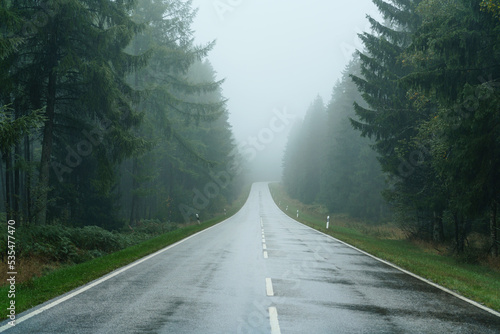 © Igor, Naklejka premium A foggy road through the forest. Fog and rain on the expressway.