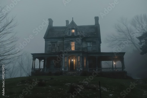 Obraz premium A foggy scene features an ominous, old-fashioned house with a dimly lit...