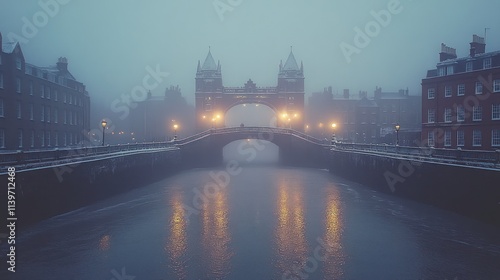 © logyartstudios, Obraz premium A foggy view of a bridge over a river, illuminated by soft lights in a tranquil setting.