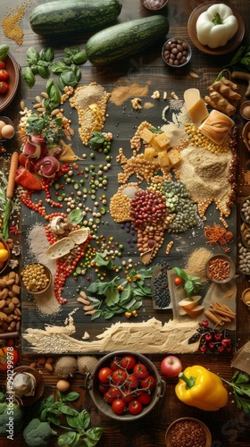 Fototapeta premium A food world map creatively made from grains, cheese, veggies symbolizing...