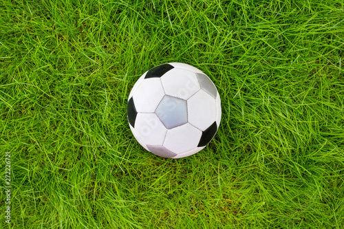 © Andrii, Obraz premium A football ball on green grass. A view from above.