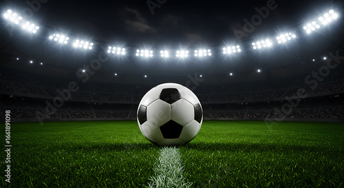 Obraz premium A football sits on a vibrant green pitch, beneath the brilliant stadium...