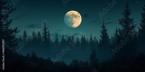 © Thanthara, Fototapeta premium A forest at night with a full moon in the sky