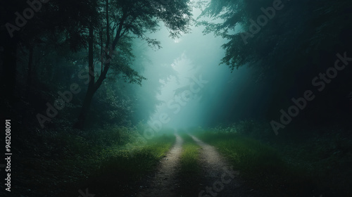 © WETDREAM, Fototapeta premium A forest at night with a road in the middle