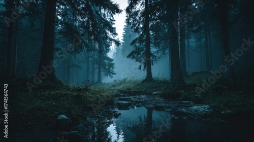 Fototapeta premium A forest at night with a stream running through it. The trees are tall and...