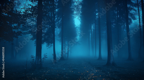 Obraz premium A forest at night with trees whose trunks can be seen and fog, all in a dark blue. Generative AI.