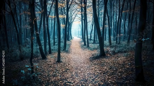 Naklejka premium A forest background image showcasing a dark forest path leads into the...