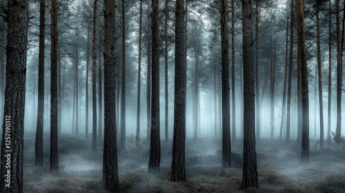 © SaraPuspita, Naklejka premium A forest background showcasing a dark pine forest shrouded in a thick fog