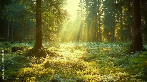 © Sinechana, Fototapeta premium 9.A forest bathed in soft, golden sunlight, with beams of light breaking through the dense canopy. The ground is covered in a variety of plants, trunks, and twigs, creating a natural mosaic of