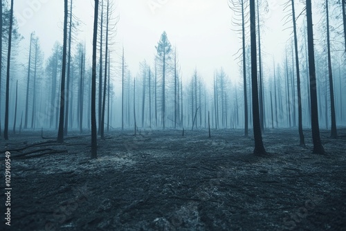 © Kanisorn, Naklejka premium A forest completely burned by a wildfire, blackened trees and ash-covered ground, low light