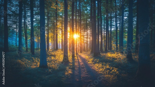 Fototapeta premium A forest edge with the sun setting behind the trees, gradually giving way to...