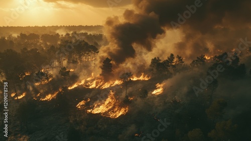 Naklejka premium A forest engulfed in flames, with billowing smoke rising into the sky,...