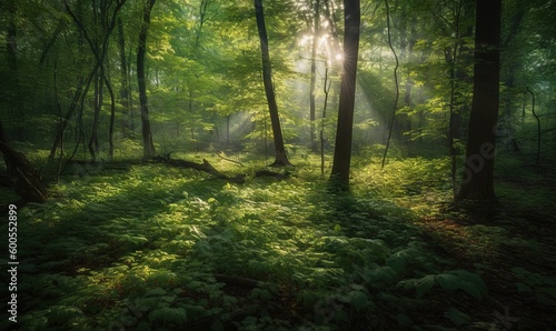 Fototapeta premium a forest filled with lots of green trees and grass covered ground. generative ai
