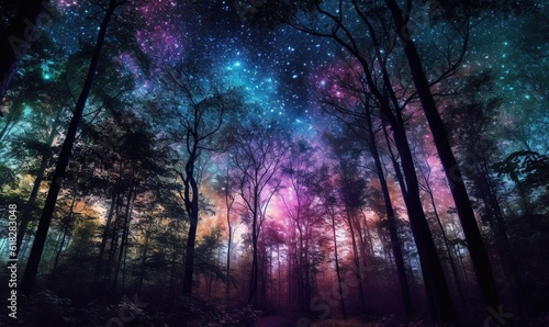Fototapeta premium a forest filled with lots of trees under a night sky. generative ai