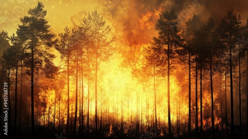© sarun, Fototapeta premium A forest fire consuming trees, representing the increase in wildfires due to global warming.