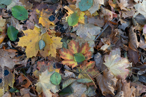 Fototapeta premium A forest floor blanketed with fallen maple leaves, creating a rich, colorful...