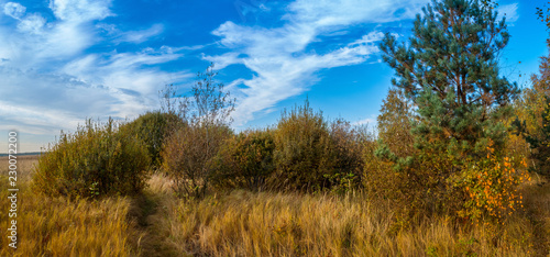 Fototapeta premium A forest glade bathed in the light of the setting sun.
