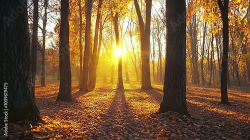 Fototapeta premium A forest is lit by the sun as leaves fall from tree branches and cover the ground with fallen foliage