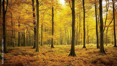 © GoldPumaze, Obraz premium A forest of towering trees with bright yellow leaves in autumn.