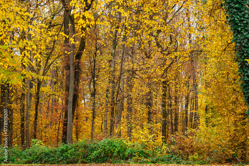 © Matthias, Fototapeta premium A forest of trees with vibrant autumn colors against a cloudy sky.