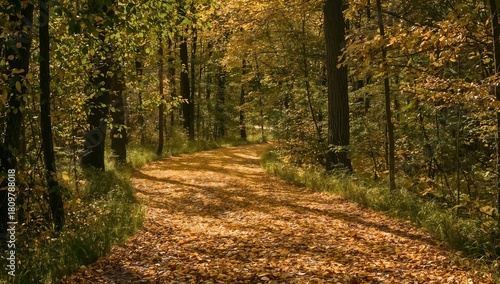 Obraz premium A forest path carpeted with yellow and orange autumn leaves, with dappled sunlight filtering through the trees. A tranquil, seasonal landscape for a peaceful nature walk.