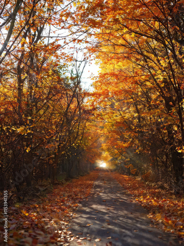 Naklejka premium A forest path covered in golden autumn leaves, with trees arching overhead in...